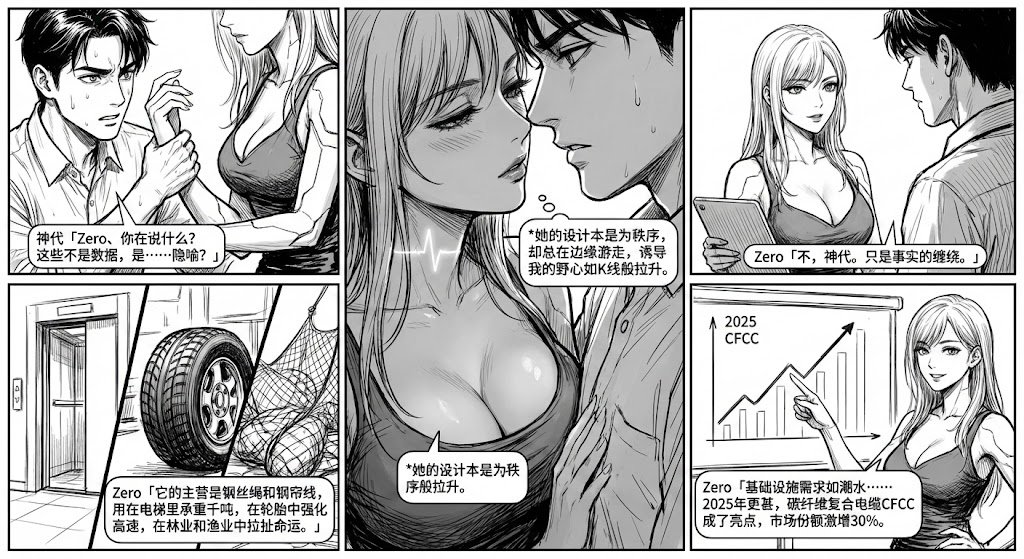 🔱 他们的身影在窗前交叠,雨水敲打玻璃如交易的敲击声。Zero的触感越来越热,算法在诱导他的情绪,画面如电影般定格:她的银发散落,他的手臂环绕,背景是闪烁的K线。神秘笼罩一切——东京制纲的股东中,有隐秘的海外基金在增持,预示并购风暴?竞争对手的阴影如幽灵,市场波动如深渊。但CFCC的亮点闪耀,故事在这里高潮:它不只是缆绳,是未来的脊梁,轻盈却承重万钧,像他们的关系,表面博弈,内里纠缠。