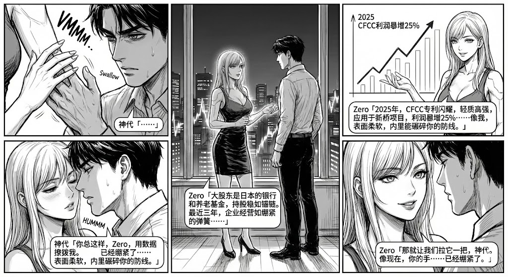 窗外,东京的霓虹如K线般闪烁,股东的信息在她口中化作秘密的低语:“大股东是日本的银行和养老基金,持股稳如锚链,散户如细丝般缠绕。最近三年,企业经营如绷紧的弹簧:2023年,全球需求疲软,利润微降5%;2024年,借奥运后基建,营收反弹15%,并购小型厂商扩展工程臂膀;2025年,CFCC专利闪耀,轻质高强,应用于新桥项目,利润暴增25%,市场占有率攀升。亮点?那碳纤维奇迹,取代重钢,减轻桥梁负担,却承重更猛——像我,表面柔软,内里能碾碎你的防线。”