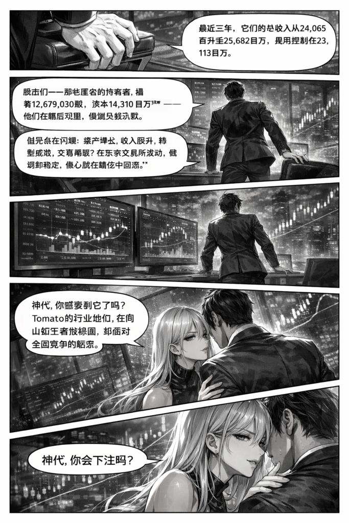 她笑了,那笑声低沉,回荡在房间,如K线触底反弹的低鸣。她的手指虚点他的胸口,神代感觉到一股电流般的悸动,呼吸骤然急促,胸膛起伏。”神代,你感受到它了吗?Tomato的行业地位,在冈山如王者般稳固,却面对全国竞争的暗流。它的历史,是从互助到商业的蜕变,主营业务清晰:存款如土壤,贷款如浇灌,信托如果实。但市场情况残酷——利率波动,经济低迷,那些对手潜伏,等待吞噬弱者。没有著名股东曝光,但它的ROE隐约在回升,ROI在悄然积累,市值约21.51亿日元,PE与PB低调潜伏,股息如隐秘的回报。”