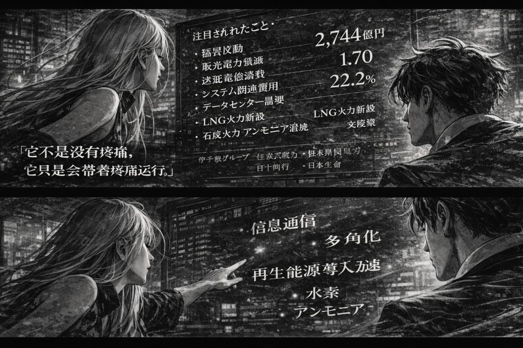 她把“注目されたこと”那一行也放进画面里,但没有念出完整句子,只把几个词拆开,像在他掌心写字:猛暑反动、販売電力量減、送配電修繕費、系统相关费用、数据中心需求、LNG火电新设、石炭火力アンモニア混焼、支援策。每一个词都是真实经营里的摩擦音,不浪漫,甚至有点粗糙,却正因为粗糙,才让这家公司显得更像活物——它会受天气影响,会被物价挤压,会为维修和系统掏钱,也会在下一阶段为数据中心负荷、新火电和混烧路线争取位置。